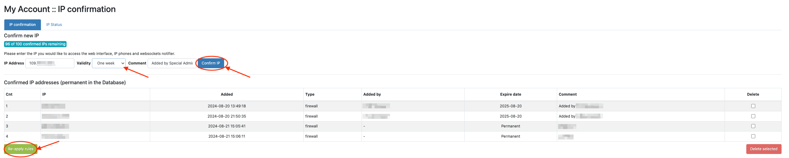 Your IP address will be filled in automatically. Click Confirm IP and Re-apply rules