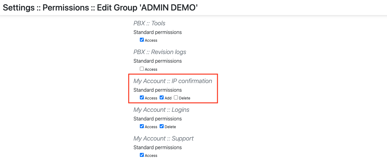 - Access Settings :: Permissions, click on View Groups, choose the desired Grroup and edit the permissions in the My Account :: IP confirmation area: