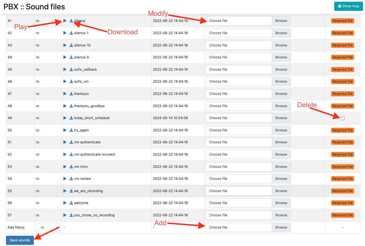 In section PBX/Sound files you can administer the sound files to be used in queues, IVRs or other contexts: