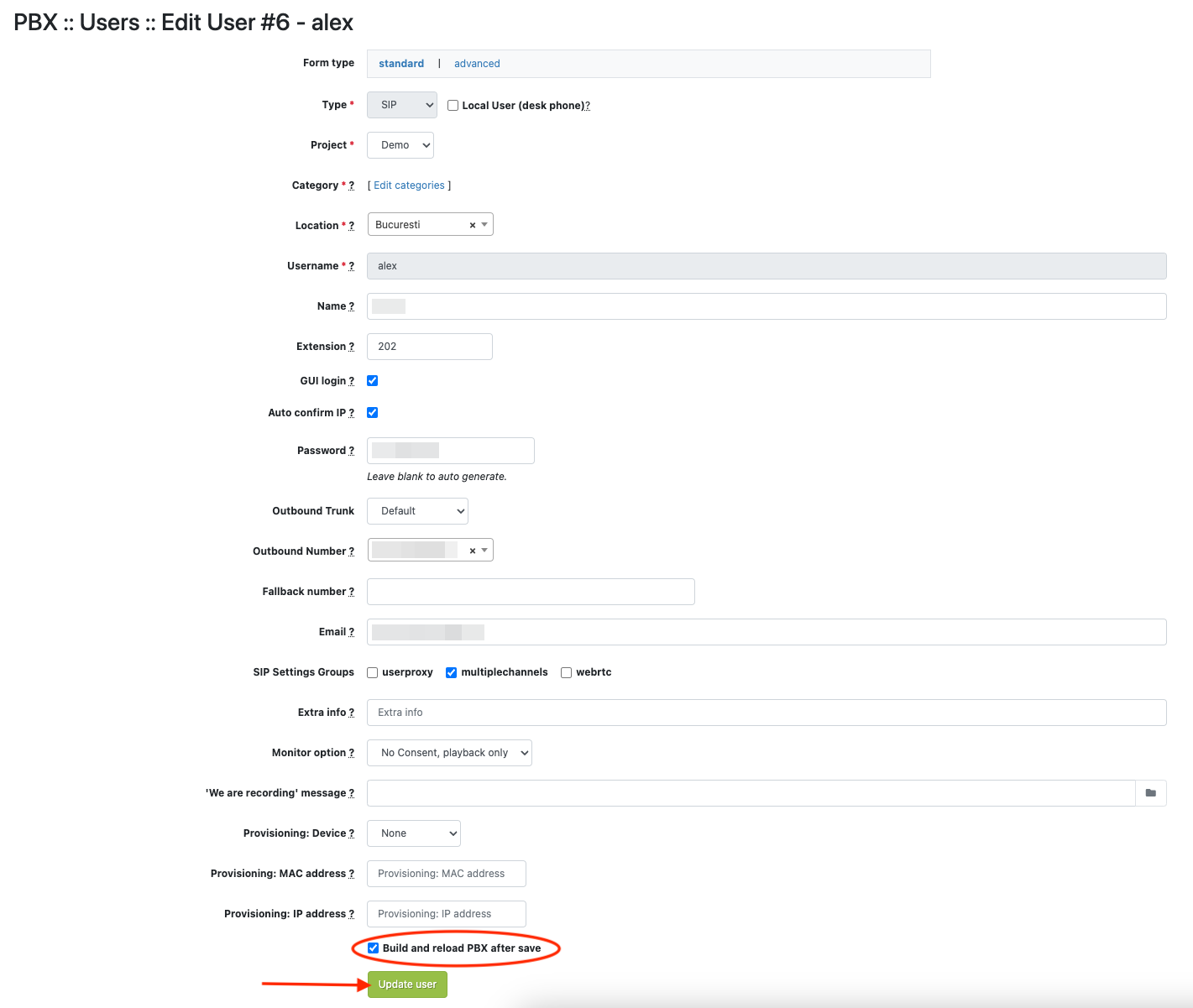 - Build and reload PBX after save: Check ; default and it is necessary before finishing adding the user