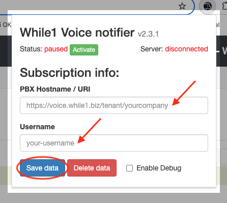 - In field PBX Hostname: add the link you received by email. The link must be of the form voice.while1.biz/tenant/YourCompany