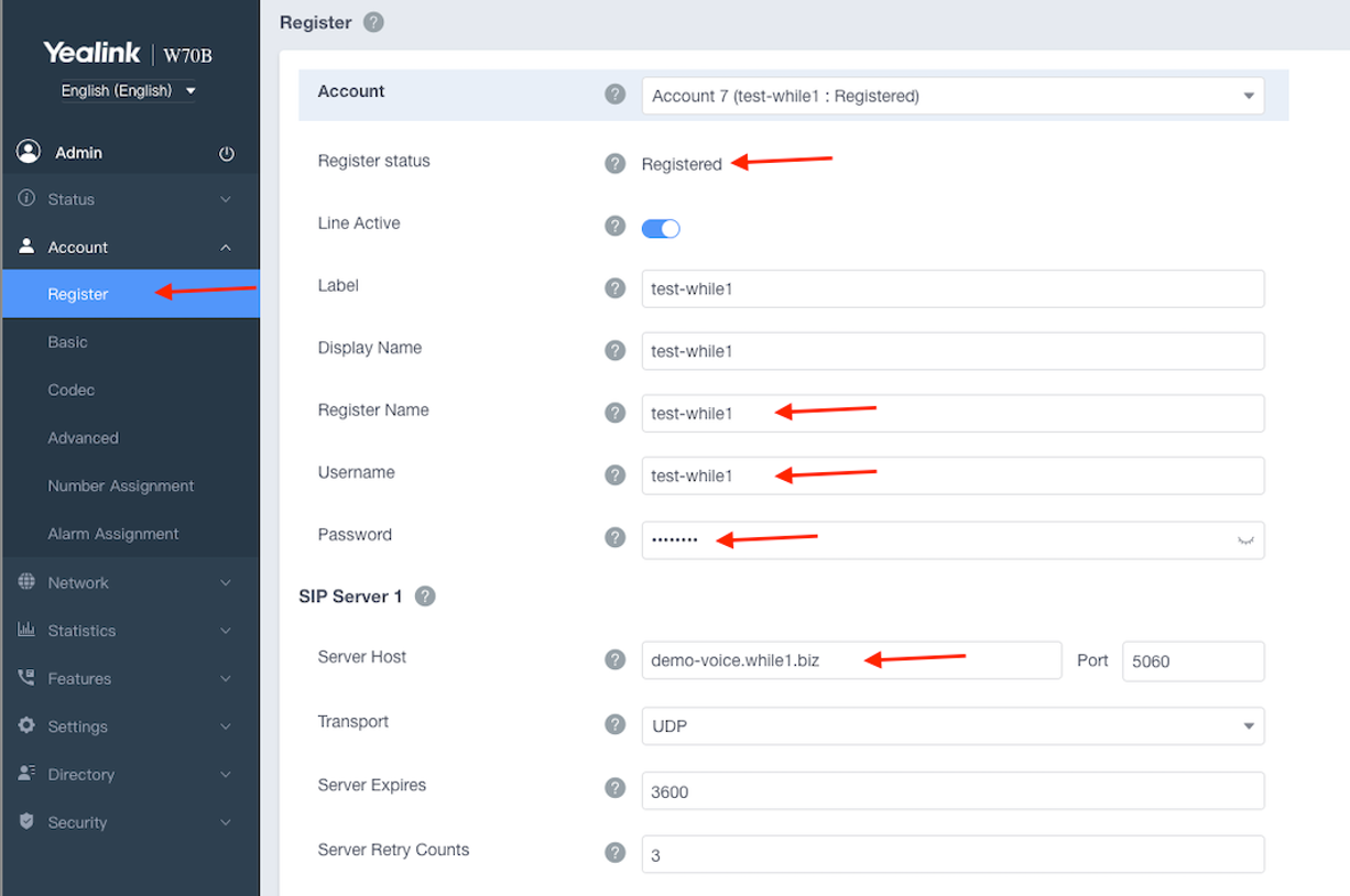 3.1. Access the web interface of the phone, section Account -> Register¶