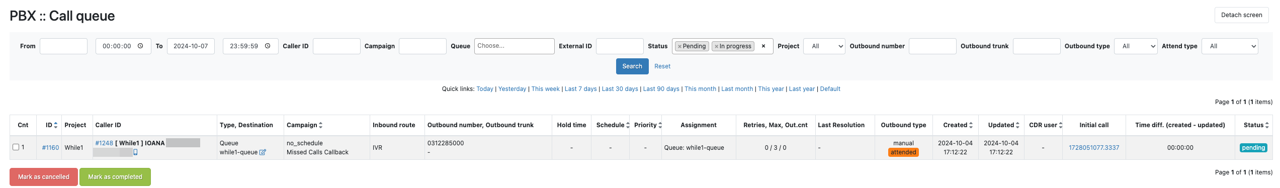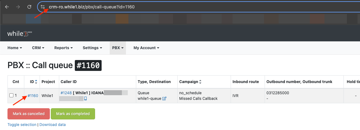 De asemenea, pentru fiecare apel din lista PBX / Call queue se poate genera un link de apel prin click pe diez (#) din a doua coloana:¶
