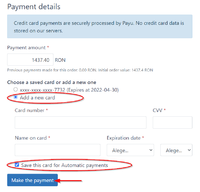 Daca aveti deja un card salvat de la o plata anterioara, dar doriti sa platiti si sa salvati un alt card, datele efectiv ale cardului nou se adauga la pasul final al procesul de plata, in pagina PayU.