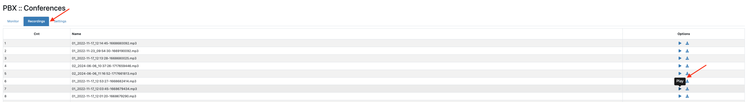 - Accesati PBX / Conferences / Recordings pentru a asculta inregistrarea unei conferinte incheiate (conferinta este inregistrata implicit, daca nu a fost selectata optiunea Disable (no monitor))