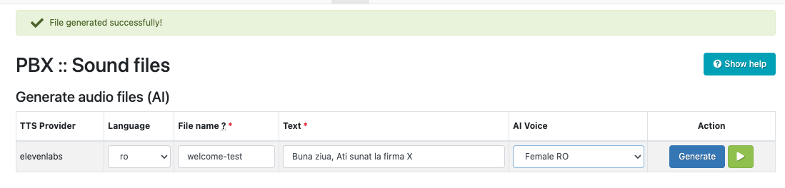 Pentru a genera automat un fisier audio, in sectiunea PBX/Sound Files => Generate audio files (AI) trebuie sa completati urmatoarele: